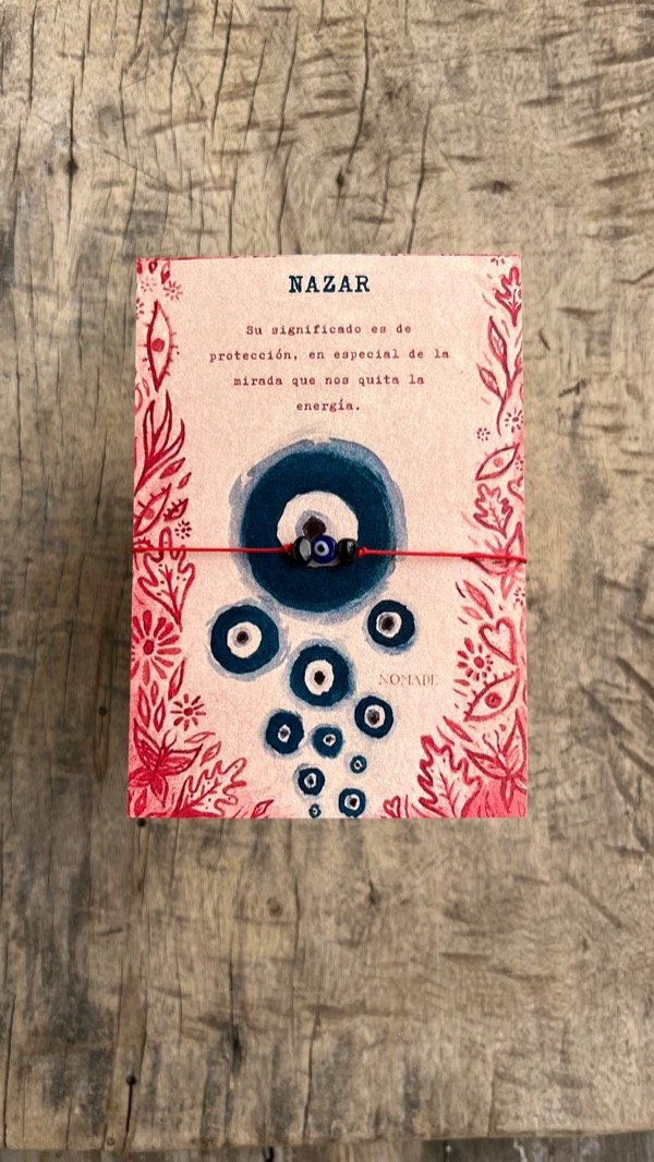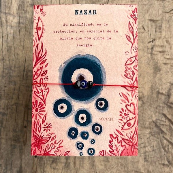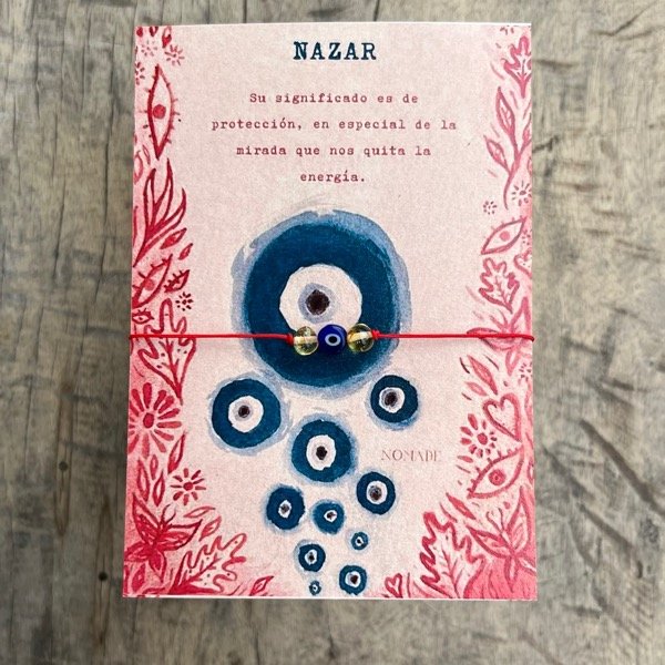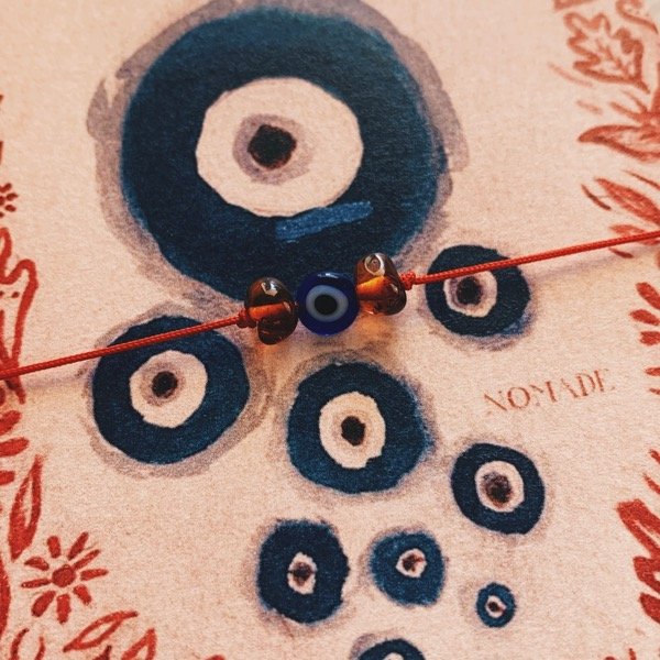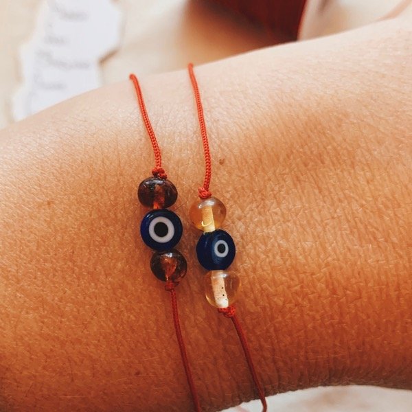Pulsera confeccionada en hilo rojo con cuentas de ámbar del Mar Báltico y dije Nazar.