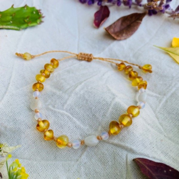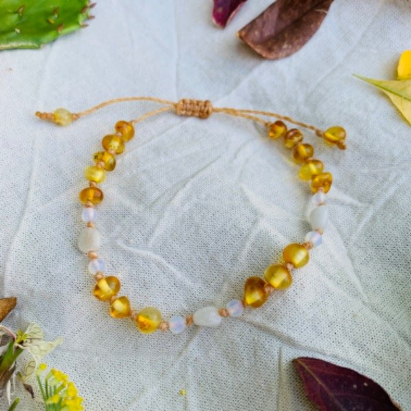 Pulsera en Ámbar Miel y Cuarzo Cristal y Piedra Luna.