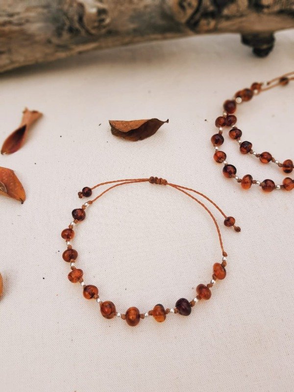 Pulsera hecha a mano en hilo encerado, cuentas de plata 925 y cuentas de Ámbar, color Cognac.