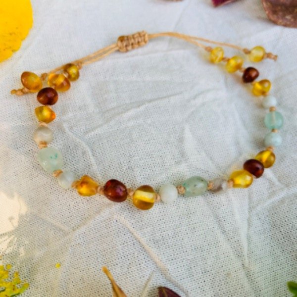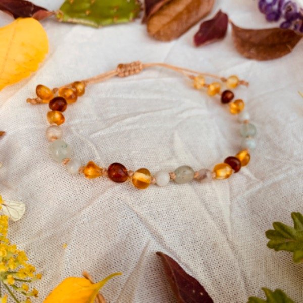 Pulsera en Ámbar Miel, Ámbar Cognac, Cuarzo Verde y Amazonita.