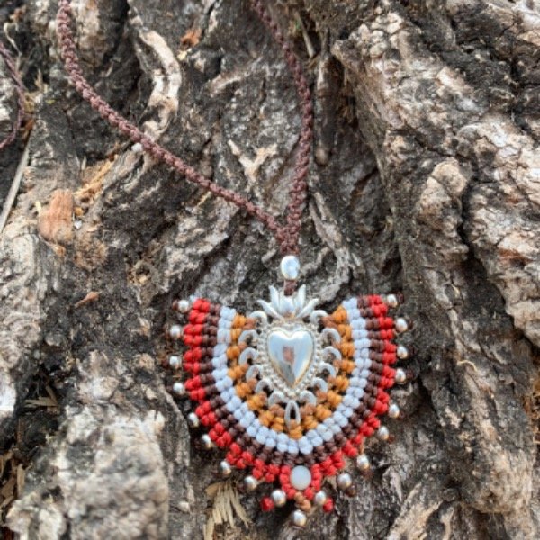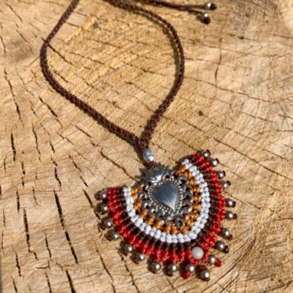 Collar tejido a mano con la técnica del macramé, en hilo encerado y dije de metal.