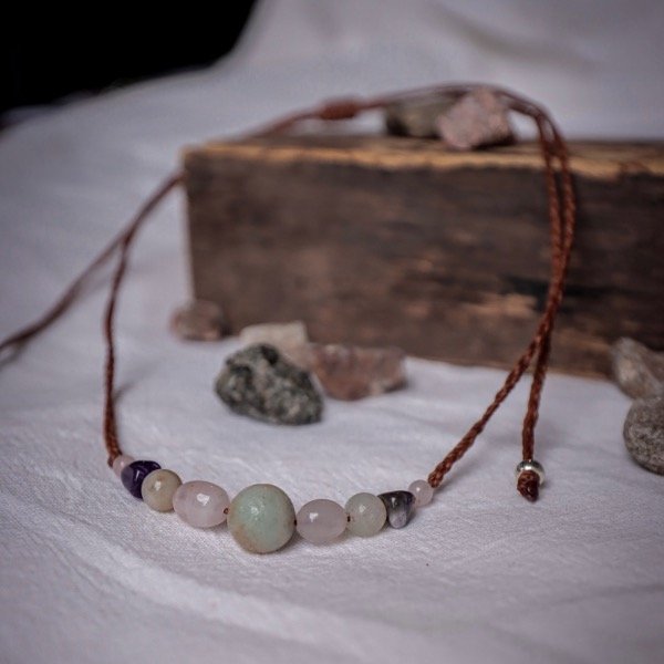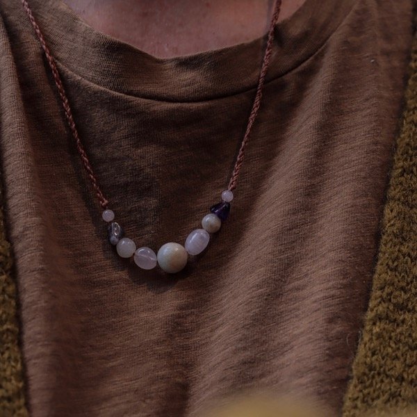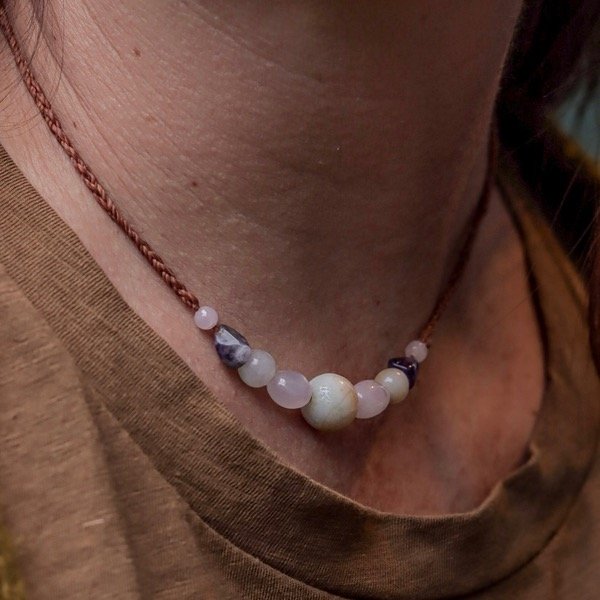 Está hecho con hermosas piedras naturales y tejido a mano con un cierre regulable para que lo puedas usar corto o largo…
