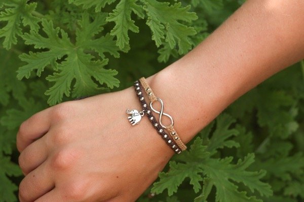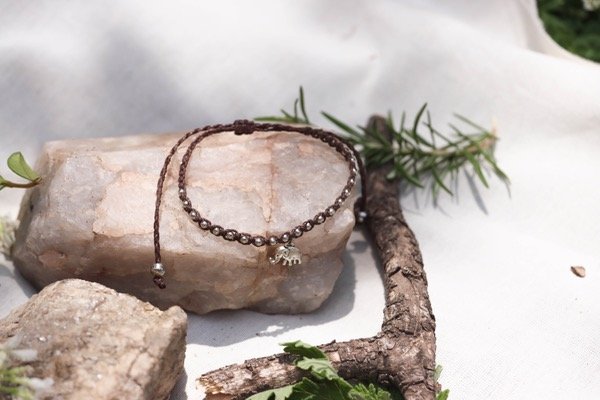 Pulsera tejida a mano en hilo encerado con cuentas y dije de metal. Resistente al agua.