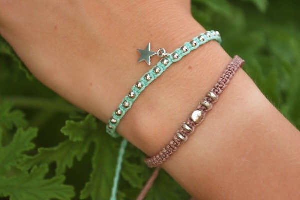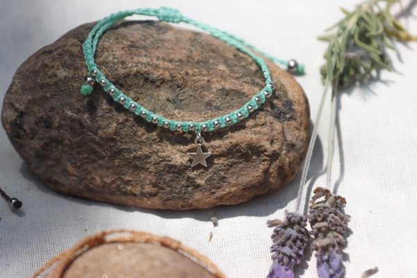 Pulsera tejida a mano en hilo encerado con cuentas y dije de metal. Resistente al agua.