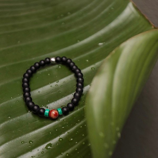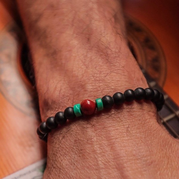 Pulsera elástica, hecha con piedras naturales, combinando Ónix Negro Mate , Turquesas y Jaspe Rojo.