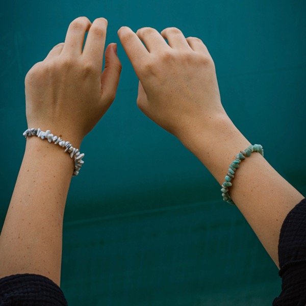 Pulsera creada en piedras naturales y final en cadena de acero con varios eslabones, lo que permite regularla en diferentes medidas.