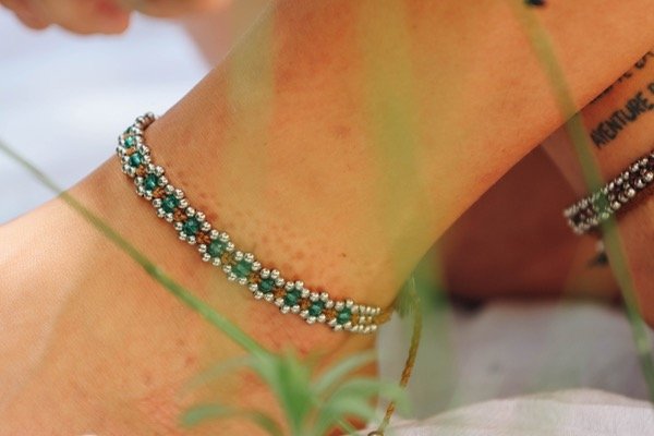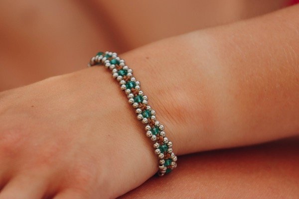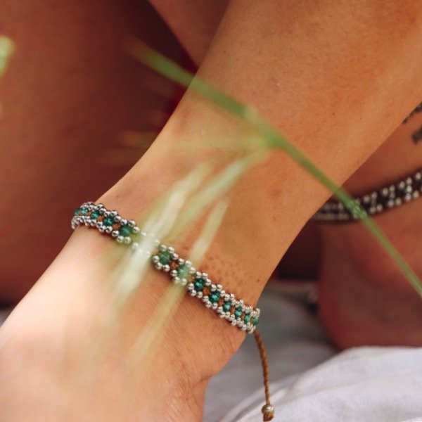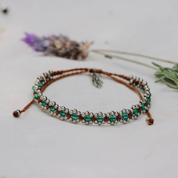 Tejida a mano en hilo encerado con la técnica del macramé, con cristales y cuentas de metal.