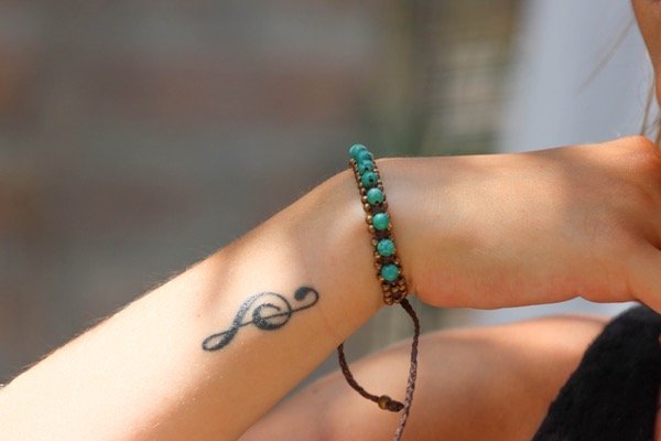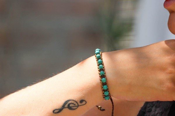 Pulsera regulable, tejida a mano en hilo encerado con cuentas de bronce y turquesas.