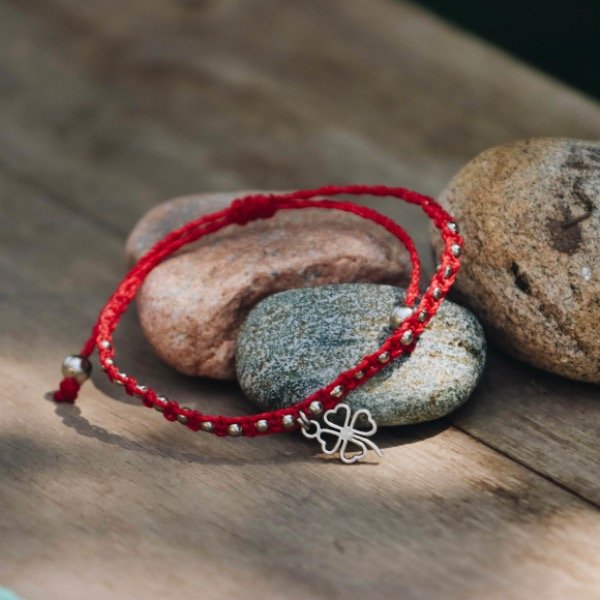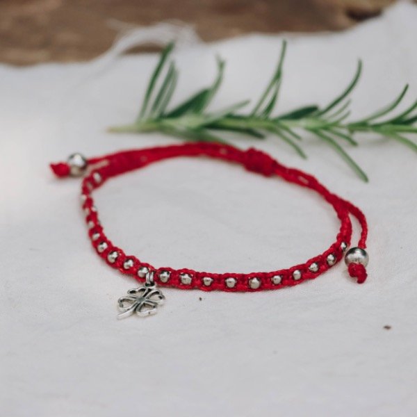 Pulsera tejida a mano en hilo encerado con cuentas y dije de metal. Resistente al agua.